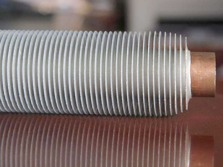 雙金屬復(fù)合翅片管是銅、鋁管(或鋼管、鋁管;或不銹鋼管、鋁管)經(jīng)復(fù)全后再軋制出翅片,具有結(jié)合緊密、熱阻小、傳熱性能好、強度高、流動損失小、防腐蝕性能強、在長期冷熱工況下不晚變形、工作壽命長等優(yōu)點。